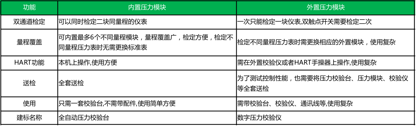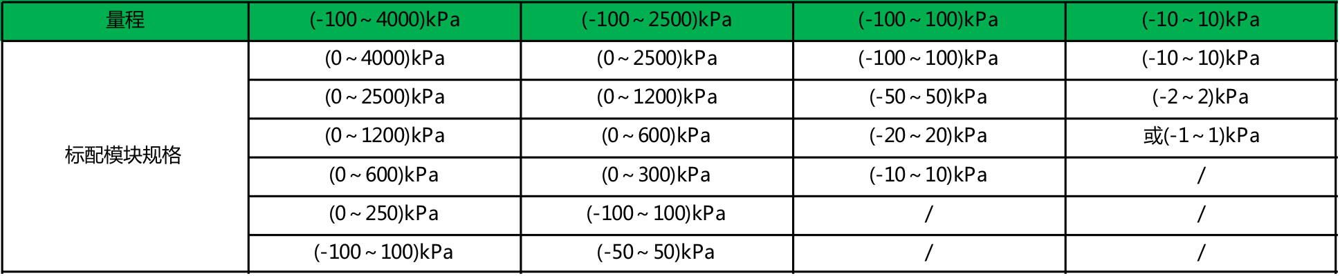 内置压力模块量程表: