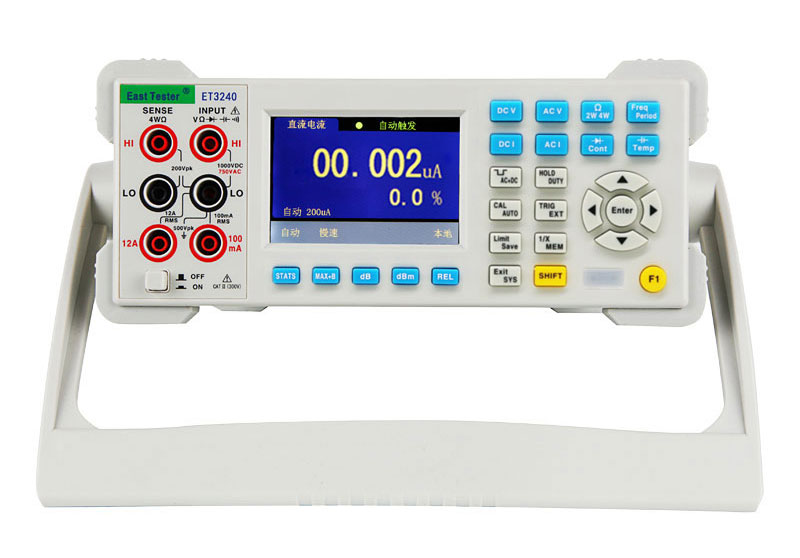 ET3240为功能全面、性能稳定的真有效值数字万用表,本系列台式万用表提供强大功能,出色的性能,良好的用户体验;3.5寸TFT液晶屏显示、读数清晰、内容丰富,具有良好的显示效果。本表采用市供电驱动使之成为高可靠性数字台表。全功能、全量程过载保护和独特的外观设计使之成为电工以及高校实验室的首要之选。